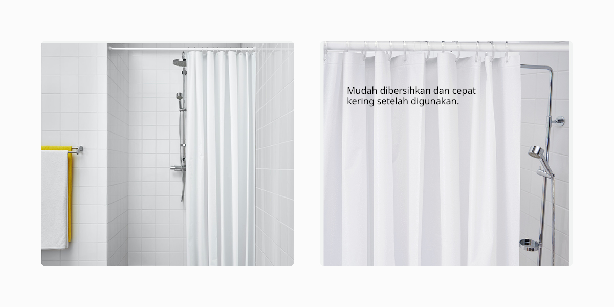 Jaga kebersihan tirai shower berbahan PEVA dengan membilas dan menyekanya secara rutin menggunakan spons basah.Rincian Produk : Tak ada yang sebanding dengan nuansa bersih dan segar saat menggunakan tekstil kamar mandi putih. Untuk ekspresi lengkap dalam warna putih, pasangkan tirai mandi ini dengan handuk LUDDVIAL.